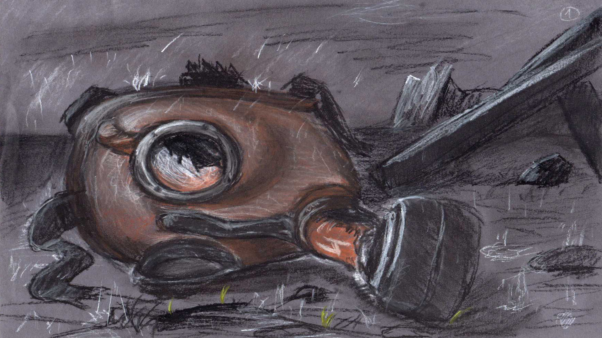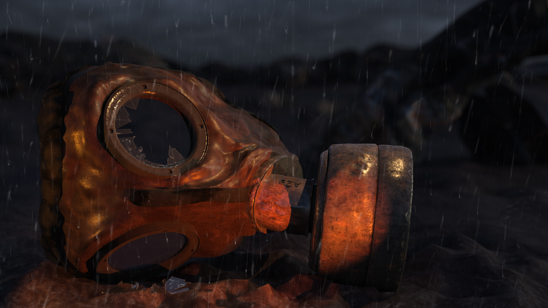 Das Modell M30 setzt sich aus gummiertem Stoff und Lederriemen zusammen. Das Glas der Augenfenster ist – wie der Filter auch – austauschbar. Gestalterisch interessant ist daher die Komposition der Materialien, welche im Still durch Korrosion und Schmutz nochmals facettenreicher wird. Ingesamt wurde die Szene nur mit wenig Licht ausgeleuchtet, um eine düstere Atmosphäre zu erzeugen. Passend zum Farbschema und dem Materialmix wurden diverse original Texturen als Referenz herbeigezogen.