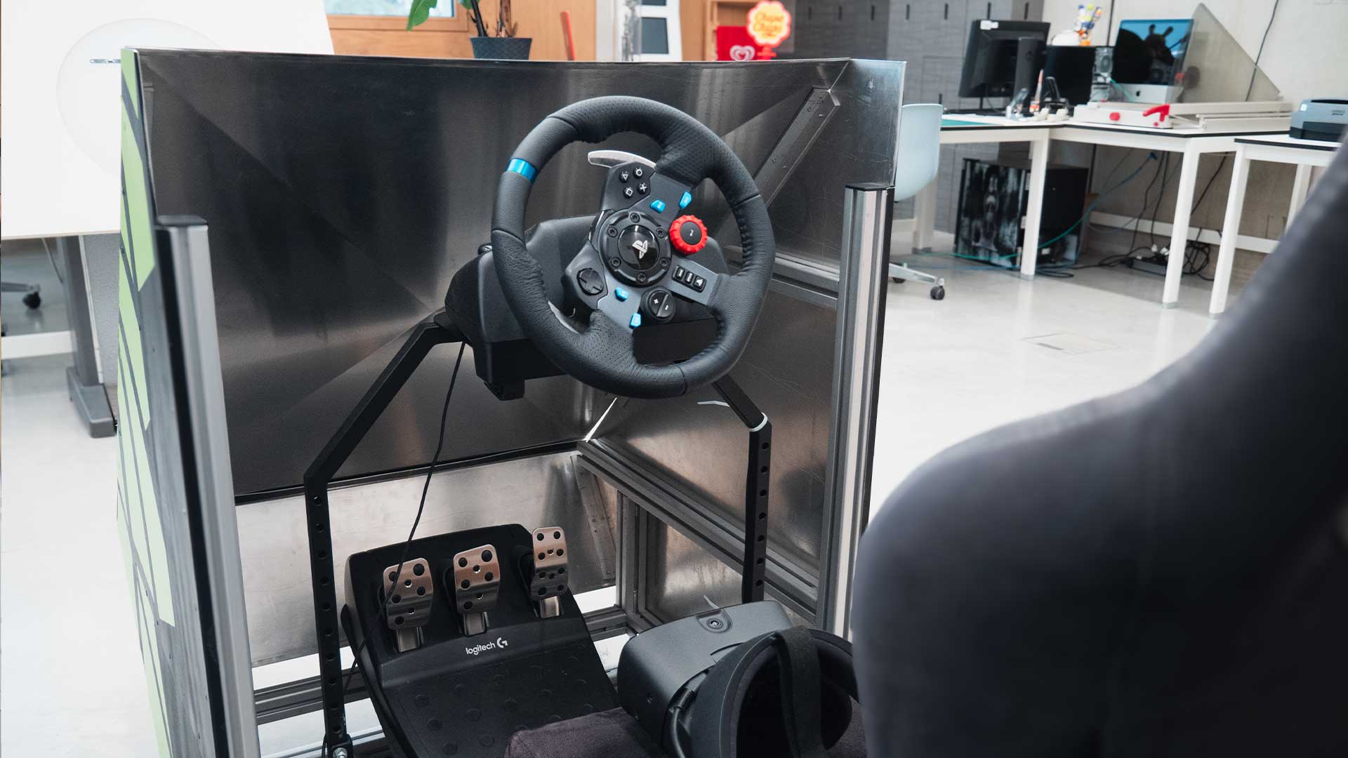 In diesem Raum können die Studierenden des Studiengangs an Ihren Projekten und Aufgaben arbeiten. Der Raum ist von 7:00 - 20:00 Uhr geöffnet und wird nachmittags zusätzlich von einer Tutorin oder einem Tutor betreut. Für die Unterhaltung zwischendurch, gibt es verschiedene Spielekonsolen, unter anderem ein Virtual Pinball (zu deutsch: Flipper). Zudem steht hier der VR Racing Seat.